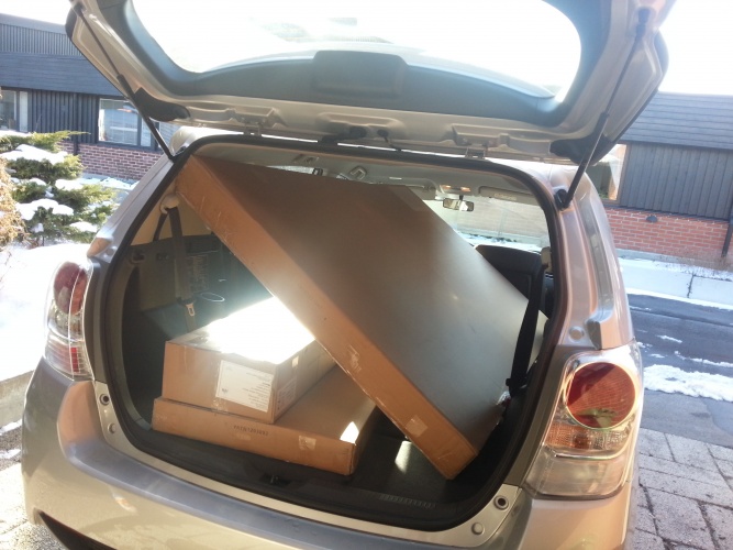 Med emballage visade det sig att bordet "växt" till ca 117x195cm! Nåja, genom att dra fram passargerarsätet så långt det gick och samtidigt lägga paketet på diagonaeln så gick det in! Körställningen var väl inte optimal men föraren hade enligt egen utsago fri sikt i alla backspeglar :)
